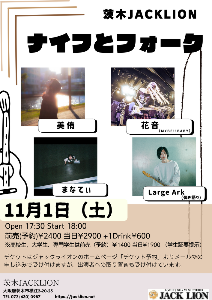 「ナイフとフォーク」 SCHEDULE 2025/11/01(土) 茨木JACKLION 地図を表示 OPEN 17:30 / START 18:00 🎫 一般 ¥2,400 / 学生 ¥1,400 (+1D ¥600) 🎤 トリ 20:00〜 大好きなJACKLIONで初めてのトリ!!!! 閉演も20:30と早めなので、皆さんぜひ遊びに来てください!!! お取り置きはこちらから!! URLをコピーする 報告する