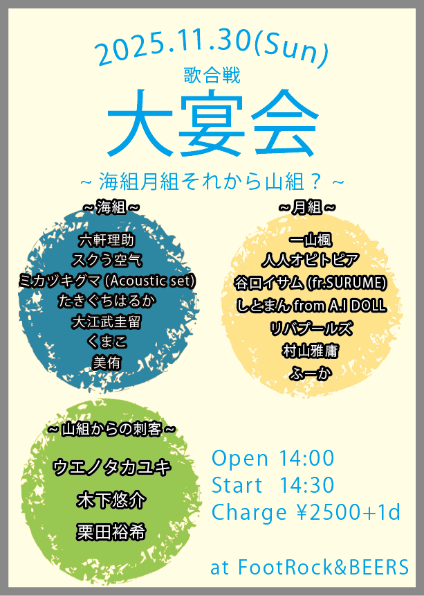 歌合戦「大宴会 〜海組月組それから山組?〜」 SCHEDULE 2025/11/30(日) FootRock &BEERS OPEN 14;00 / START 14:30 🎤 19:00〜 芝生ステージ、舞台でのサーキットイベントです! 美侑は、舞台で19:00〜歌います!! 🎫お取り置きはこちら!!! URLをコピーする 報告する