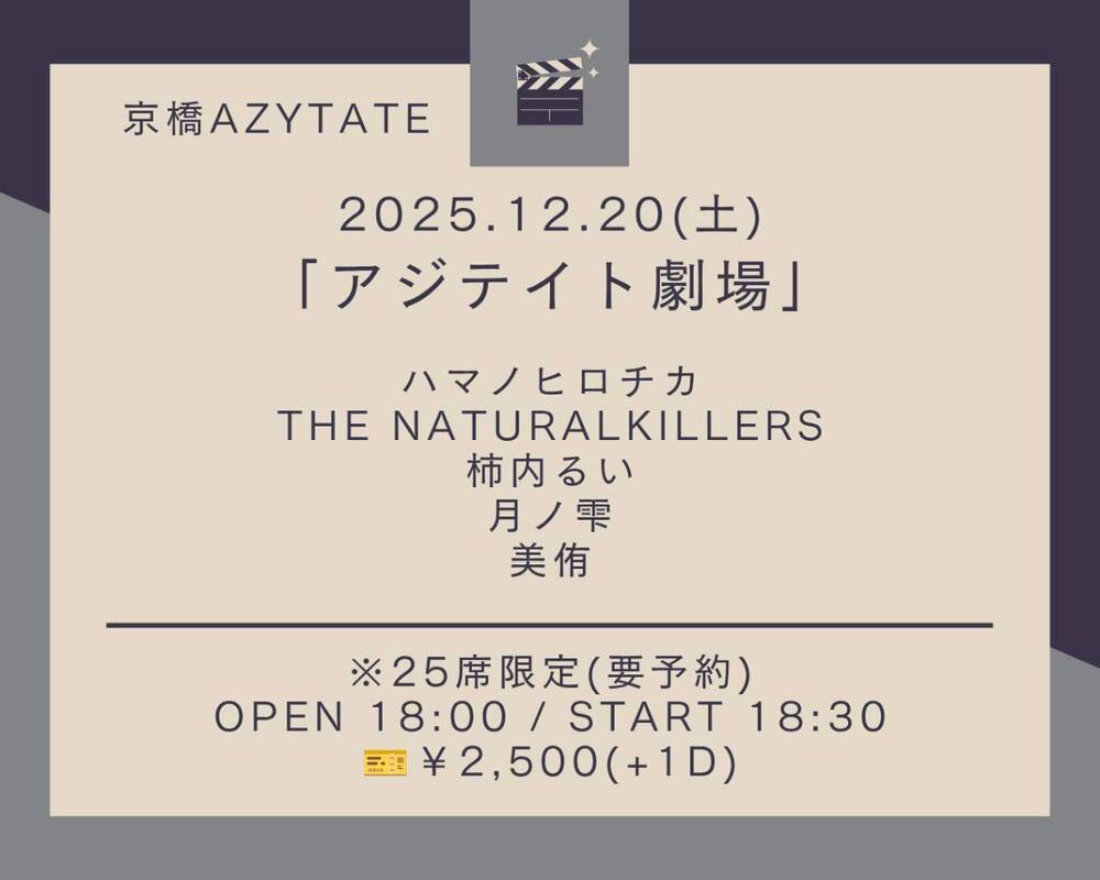 「アジテイト劇場」 SCHEDULE 2025/12/20(土) 京橋AZYTATE 地図を表示 OPEN 18:00 / START 18:30 ハマノヒロチカ / THE NATURALKILLERS / 柿内るい / 月ノ雫 / 美侑 20:15〜 🎫 ¥2,500(+1D) 🎤 4番手 20:15〜 トリ前です!!楽しみすぎる! 気合充分、ぶちかまします!! 生のLIVEを感じに来てください! 🎫お取り置きはこちら!!! URLをコピーする 報告する