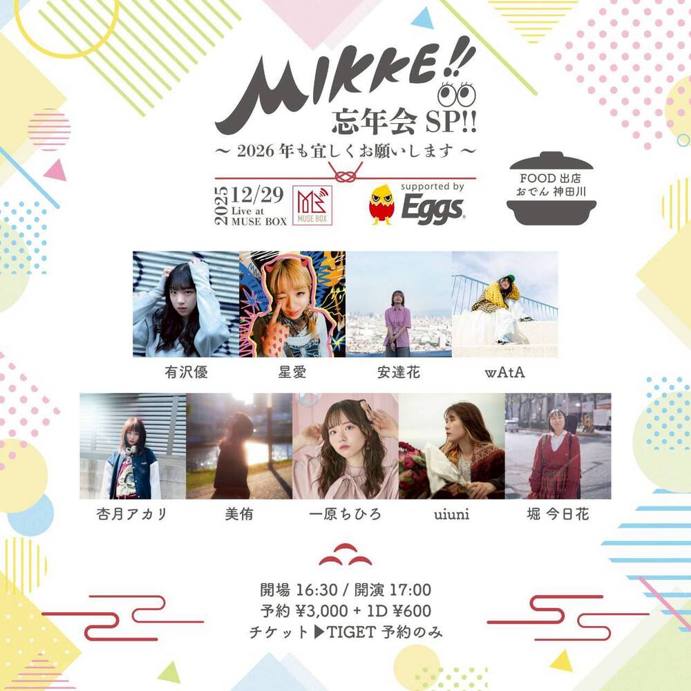 「MIKKE!! 忘年会SP!! 〜2026年も宜しくお願いします〜」 SCHEDULE 2025/12/29(月) MUSEBOX 地図を表示 OPEN 16:30 / START 17:00 豪華メンバーの中で!年末歌い納めです!!! 🎫 ¥3,000(+1D) なんと今年も出演させていただけることになりました!!!! おでんもあるし、年末歌いおさめ、熱く盛り上がりましょう!!! 🎫お取り置きはこちら!!! URLをコピーする 報告する